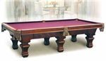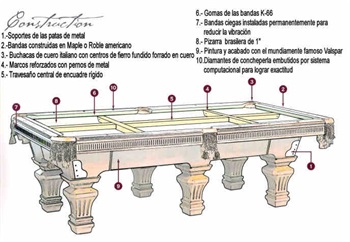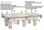 Elegante Mesa de Pool de 9 Pies con acabados en madera de Nogal antiguo y señales de doble diamante de concheperla, de estructura de madera sólida con bandas de Maple Americano totalmente construida con cortes perfectos programados computacionalmente, con sistema (CNC) Pizarras Brasileras de 1 Pulgada, , bandas de goma Master Speed K-66 , finas y esplendidas buchacas de cuero curtido cocido sobre fierro. La mesa tiene un peso de 900 Libras. Inluye traslado y armado en Concepcion, Incluye kits de accesorios aramith stdar cod. 2923 e Incluye paño imperial USA color a definir